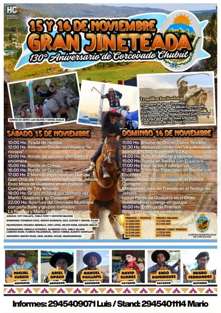 Corcovado, Chubut. – La localidad de Corcovado se prepara para vivir una verdadera fiesta de la tradición con la Gran Jineteada en el marco de su 130° aniversario, los días 15 y 16 de noviembre.